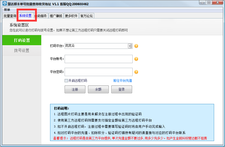 3、如果查询的单号数量多,建议使用远程打码,效率更高