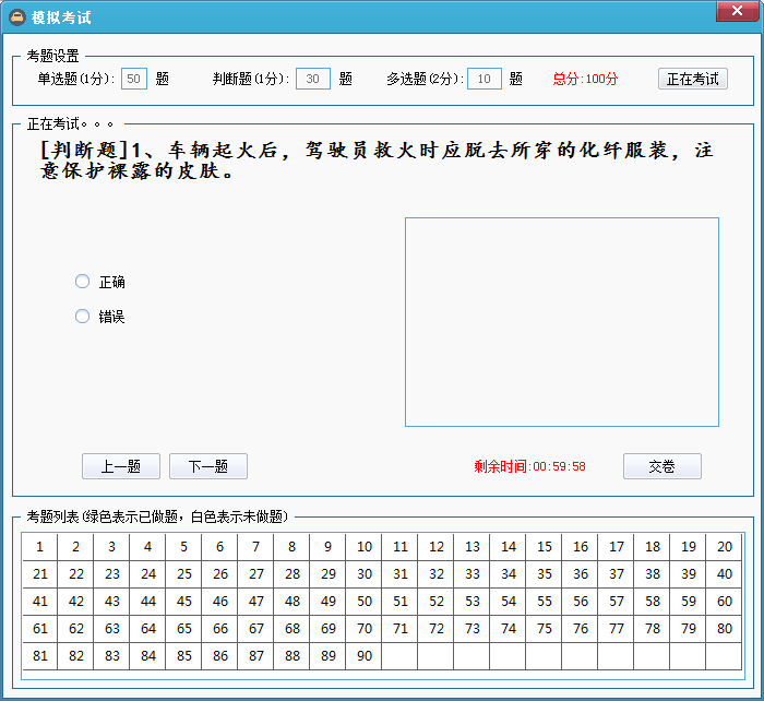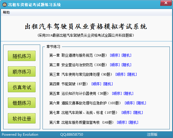 出租车资格证考试题练习系统是一款专门针对出租车汽车驾驶员从业资格而开发的模拟考试系统,考试内容一共有九个章节,采用了2014年最新出租车汽车驾驶员从业资格考试全国公共科目题库,软件提供了随机练习、顺序练习、仿真考试、错题练习等几种方式,让你能够全方面掌握所有题目,一次考过。