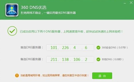 3、我们的网络就按照访问速度最快的DNS服务器开启啦,如果你是局域网用户,如果在网络使用中发现异常的话,请记得及时恢复哦。
