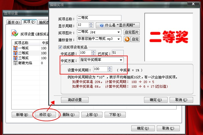 4、允许任意增加、删改抽奖奖项,各奖项可分别设置其奖品份数、显示周期、图片、音效和开奖方式。