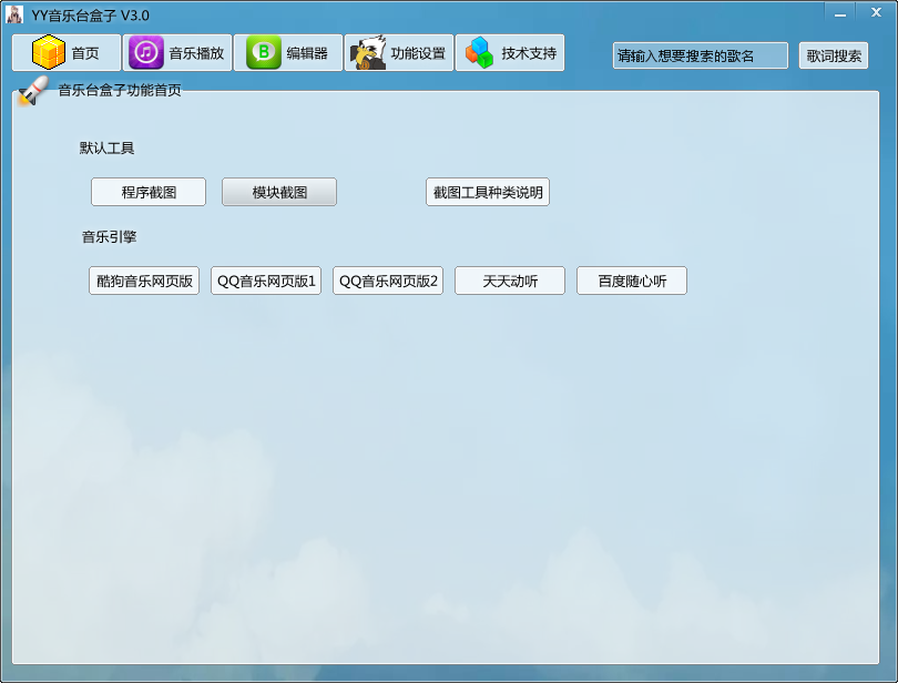 YY音乐台盒子是一款集音乐播放、文本编辑、快速截图等功能于一体的多媒体娱乐软件,软件提供了多种音乐引擎,可以实现多种音乐功能。软件完全免费,绿色安全,方便使用秒,欢迎下载体验。