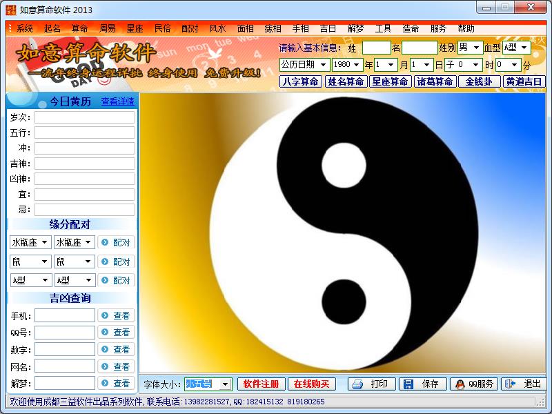 如意算命软件是一款全能型的电脑算命软件,如意算命软件的最大特点在于它的功能非常多样,它集八字算命软件、姓名算命软件、周易算命软件、星座算命软件、风水算命软件、面相手相软件、黄道吉日软件、周公解梦软件、测字算命软件于一体,是一款综合性的算命软件,具有算命行业ERP之称。