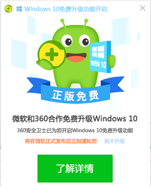 2.360安全卫士已为您开启windows10升级功能,当windows10正式发布,第一时间提醒您
