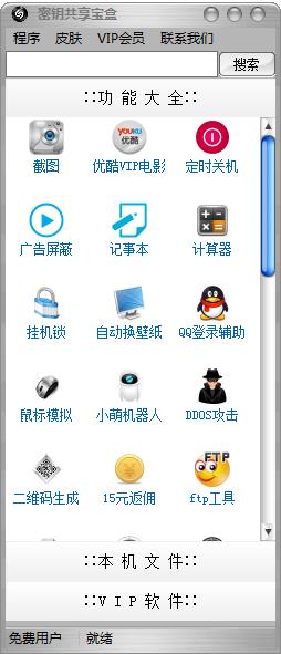 密钥共享宝盒是一款全能型的电脑工具箱,它是一款非常实用的多功能电脑工具箱,这款密钥共享宝盒拥有非常多的功能,如快捷截图、广告屏蔽、记事本、计算器、日历、自动更换桌面壁纸、挂机锁、定时关机等等,目前软件有三大模块,其中包括:功能大全、本机软件和VIP软件。