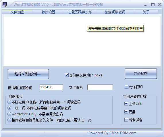 Word文档加密器专为用于Word文档加密,相比Word自带的加密功能,本工具加密更加暴力,无法破解。通过与用户主板cpu、硬盘、网卡进行绑定,实现一机一码授权,这样能够确保文档内容的绝对安全。同时软件还提供了多种不同加密方式,以满足更多用户的需求。