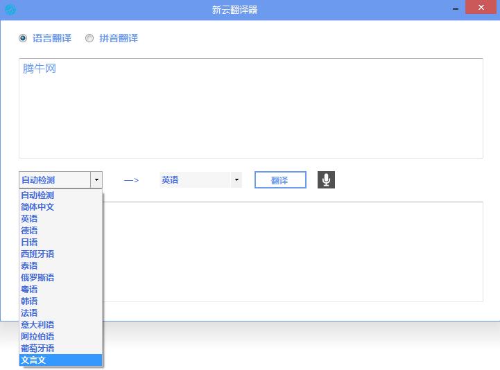 新云翻译器是一款由唯忆新云工作室推出的多语言翻译神器,这款软件不仅小巧好用,而且界面简洁大方,最重要的是它支持多达十四中语言之间的互译,新云翻译器操作简单,你只需要在翻译框内输入要翻译的文字,它就能自动帮你检测源语言,让你自由翻译成多国语言,同时它还支持发音功能哦!