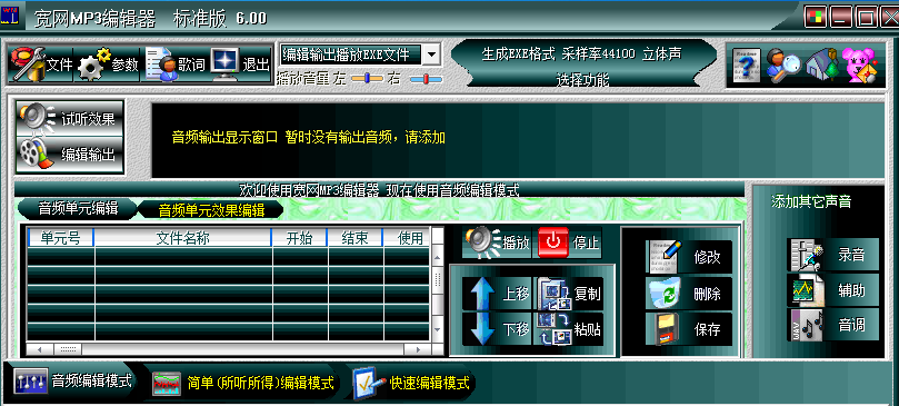 提供三种音频编辑模式,包括所听即所得模式、音频编辑模式及快速编辑模式,充分满足不同要求环境下音频编辑功能。