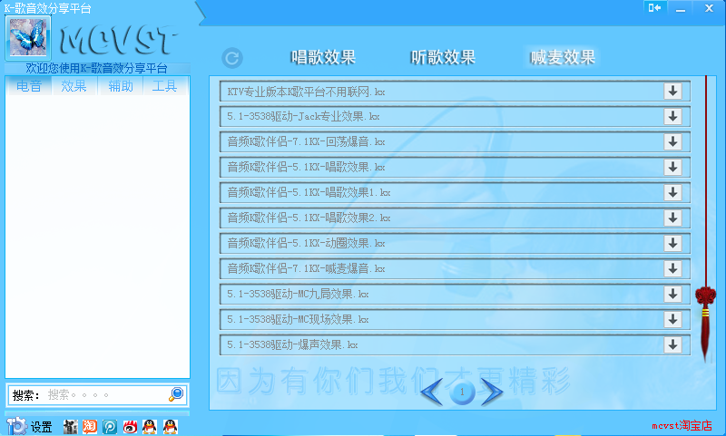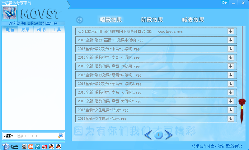 K歌音效软件是一个专业的音效分享平台,海量丰富的音效包含唱歌效果、听歌效果、喊麦效果,可以广泛应用与网络K歌,MC喊麦。所有的音效完全免费下载使用,免费带有一键电音效果,看电影现场听觉效果,喊麦效果,唱歌效果,让你的音乐音效更加好听。