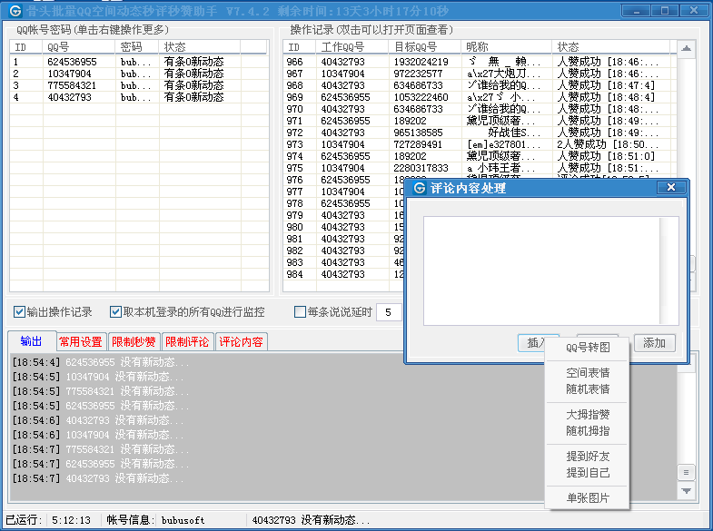 骨头批量QQ空间动态秒评秒赞助手是一款由骨头软件推出的空间秒赞秒评软件,这款软件体积小巧,资源占用低,它能帮助你随时监控你的空间好友动态,一旦你的好友有新的说说或日志发布,它就能帮助你一键秒赞秒评,非常给力,目前支持获取本机QQ,免验证码登录功能,QQ状态保持避免重复登录,智能融入骨头多年挂机群发经验之秘籍。