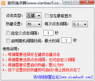 线报屋鼠标连点器是一款绿色小巧的鼠标连点工具,这款软件让你摆脱手动烦恼,只需提前预设好热键、点击类型、点击间隔之后,它就能自动模拟人工鼠标连点操作,非常适合喜欢玩电脑游戏的朋友,特别适合玩网游的朋友,而且支持自定义时间间隔,操作简单,欢迎下载使用!