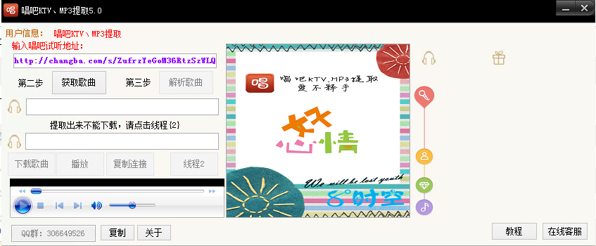 使用唱吧KTV.MP3提取歌曲,首先将唱吧试听地址粘贴到地址框中,然后点击获取歌曲,再点击解析歌曲,最后点击下载歌曲就能保存到电脑本地了。