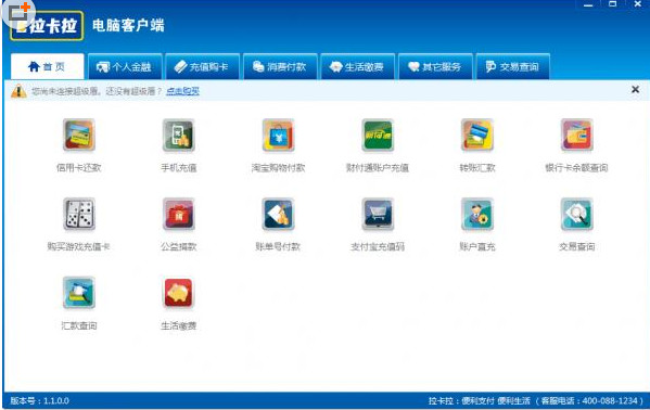 拉卡拉电脑客户端是一款专为个人用户推出的在线支付软件,这款软件体积小巧,使用便捷,可以帮助用户进行网上快捷支付,目前支持的服务包括:信用卡还款、银行卡余额查询、手机话费充值、游戏点卡充值、支付宝充值、淘宝购物、网上交易记录查询等等功能,欢迎下载使用!