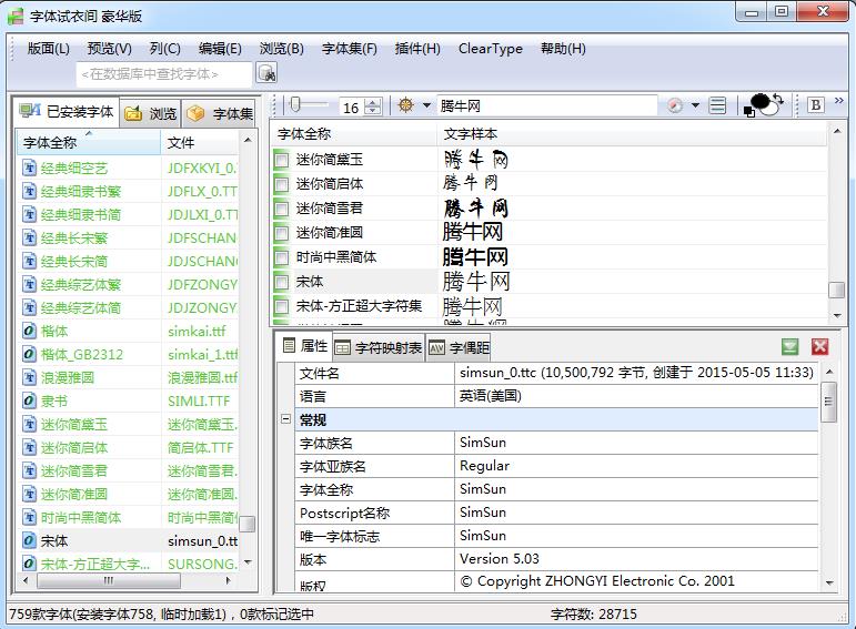 通过查看字体属性,可以知道字体在不同语言区域所采用的字体名、版权、版本、商标、制造商及URL地址等信息。通过字体试衣间对每个字体有了通透的了解后,可在程序中选择一或多个字体,直接批量安装和卸载。字体试衣间对系统缺省字体,已安装和未安装的字体使用不同的颜色显示,管理起来非常直观方便。 字体试衣间中还加入了LCD液晶显示器的ClearType字体平滑调整功能,更加方便了使用。