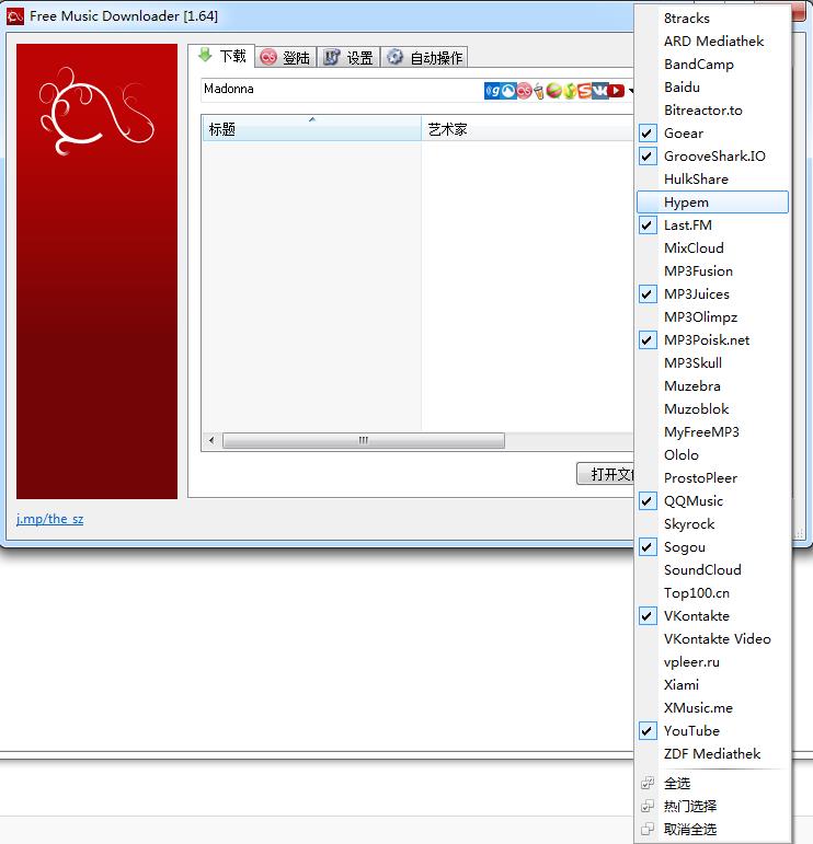 Free Music Downloader是一款免费的音乐下载器,该软件可以从百度、QQ音乐、last.fm,aupeo.com,vkontakte.ru以及Youtube等网站下载免费音乐。