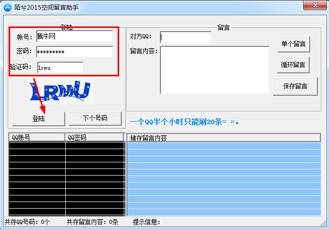 陌兮QQ空间留言助手是一款2015年最新的空间留言工具,这款工具可以帮助你一键批量留言,帮助你进行空间人气互踩互刷,另外QQ空间留言助手操作简单,你只需要登录QQ账号,然后输入对方QQ,接着设置好要留言的文字内容,保存之后就可以一键批量刷空间留言了,需要的朋友们快来下载吧!