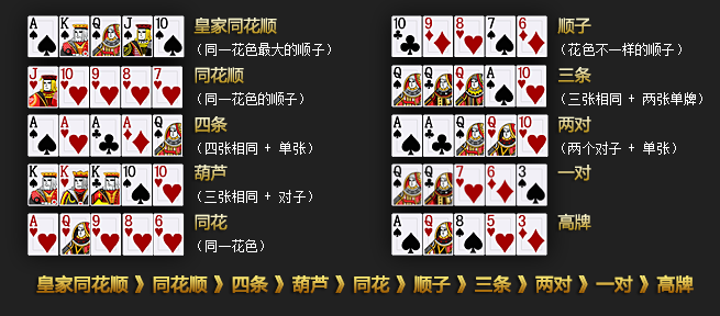 游戏规则:从底牌和公共牌中选出最大的5张,组成“成手牌”,与其他玩家比较,牌型最大的玩家胜出。