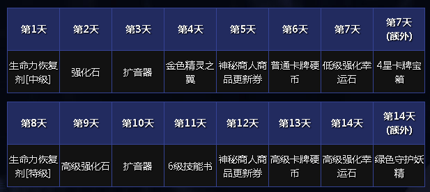 道具奖励根据连续签到天数不同而不同,连续签到7天/14天会得到额外道具奖励,奖励列表如下:
