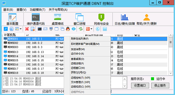远程桌面,远程视频,远程进程,远程窗口,远程QQ号获取,远程执行命令等功能更有利于网吧管理,排查问题。还可远程发送消息,公告,不影响全屏中的游戏。