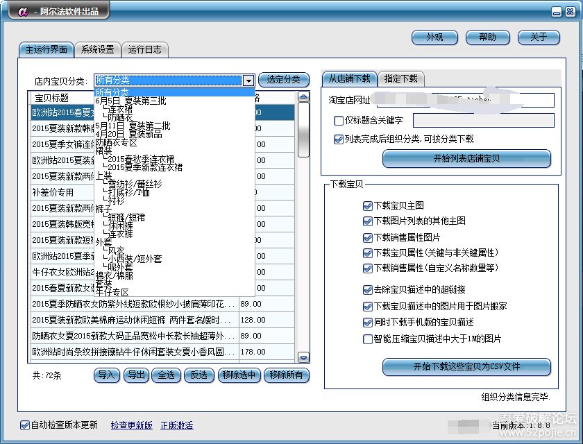 本软件可以下载淘宝(淘宝店、天猫店)宝贝,整店宝贝下载、按分类下载宝贝、指定下载。