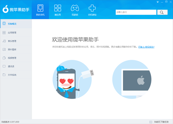 微苹果助手不越狱、免费装、全正版,只需将您的爱机连上电脑,就能轻松管理你的应用、音乐、照片和视频等,还能免费搜应用,下载游戏等。