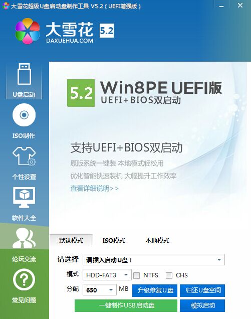 大雪花U盘启动盘制作工具实现一键制作启动U盘,真正方便快捷。大雪花制作启动U盘成功率极高,目前 没有碰到过不能制作启动盘的U盘。大雪花启动的PE系统,具有极强的硬件兼容性,装机工具齐全,可以为各类电脑安装系统。