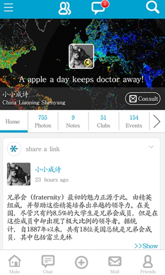 ----以你自己的兴趣爱好或所在行业为主题建立俱乐部,聚集跟你拥有相同话题的朋友,像异国、银发、时尚、飞行、游艇、设计、极限运动等等等等