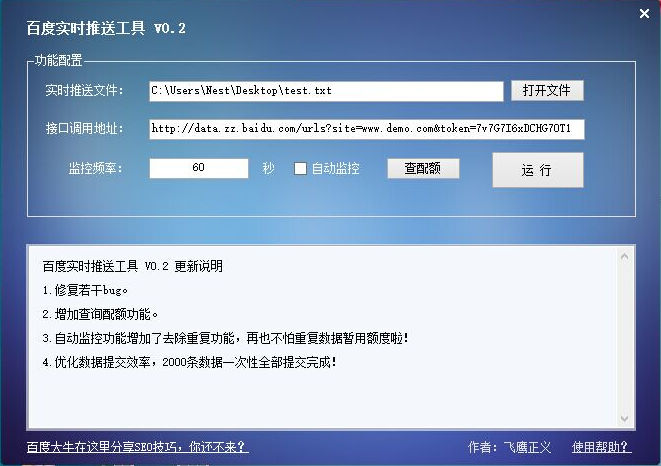 百度实时推送工具可以帮助你将站点实时推送给百度,帮助你快速有效的让百度收录你的页面,并进行排名的优化。同时考虑到了某些用户的需求特别添加了“自动监控文件变化并推送”的功能,启用该功能后程序会按照指定的时间间隔自动去检查对应的txt文件是否有新的变化,如果有新的URL会再次自动提交。但是必须要注意的是再次更新指定的txt文件的时候务必清除之前已经提交过的页面,否则老数据也会一并被提交,老数据会暂用你的每天提交配额数量。