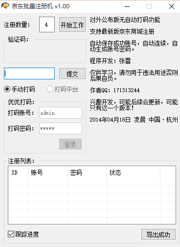 京东批量注册机可以帮助用户快速注册多个京东帐号,软件支持最新版京东商城注册,会自动保存帐号,自动连续,自动生成帐号密码。
