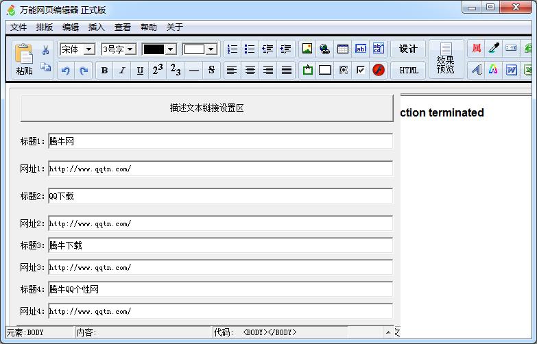 万能网页编辑器是一款绿色小巧、简单易用、功能强大的网页编辑器,这款万能网页编辑器可以用来编辑维护主页,为用户提供了很大的发展空间。万能网页编辑器也是一款简单实用网页编辑器,即使你是一个新手只要稍加学习也很很快上手。