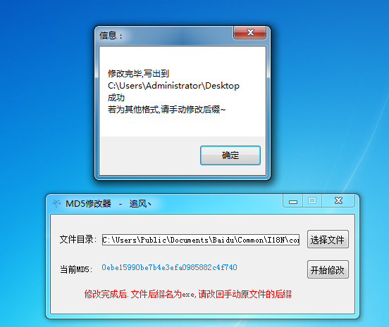 修改完成后,文件后缀名为 exe 请手动改回原文件名的后缀!