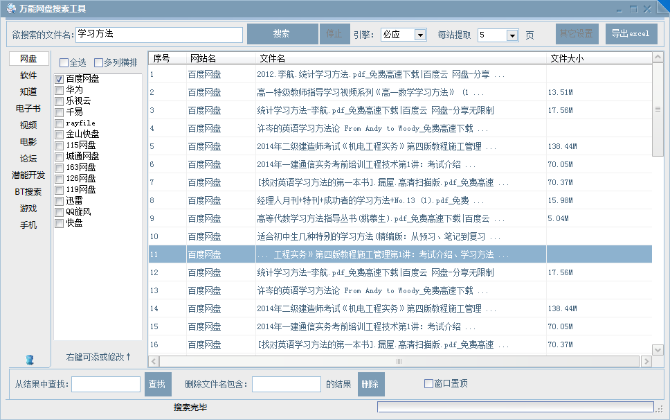 软件会根据用户所选的搜索引擎,将搜索结果按照顺序排列好,用户还可以根据自己对文件的要求,按照文件大小规格等对搜索结果进行筛选。