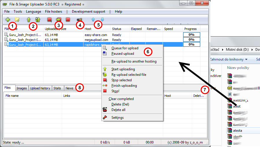 6. 菜单在队列文件:队列上传=文件将被上传暂停上传=该文件将不会被上传到用户的允许,