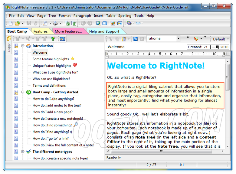 每个 RightNote 笔记本,可包含无数个页面(page);每个页面,可建立自己的树状笔记结构。用户在组织海量信息方面,具有极高的灵活性,和强大的功能。