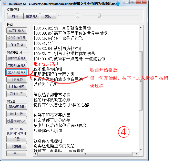 歌曲播放时,每一句开始按下“加入标签”按钮