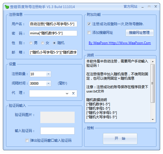 歪碰百度账号注册助手是一款简单的百度账号注册助手,输入图片验证码即可完成注册,然后会自动保存成功注册账号。并且有注册成功后登陆一次,以防止账号被百度删除的功能,相当实用。有兴趣的朋友可以试试。