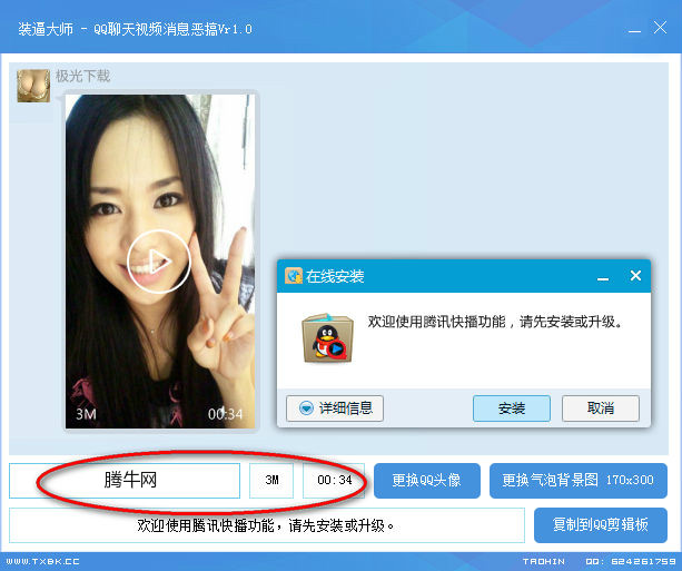 这样发给你的“朋友”们,截图的含义就相当于是你的好友给你发了一个视频,你点开视频,发现不能播放,然后腾讯提示你安装“腾讯快播”,好吧,就这样了...
