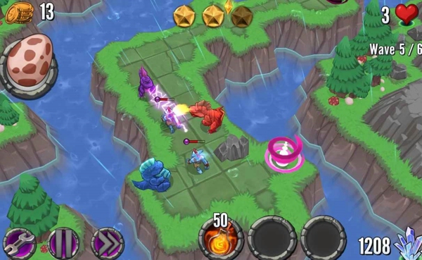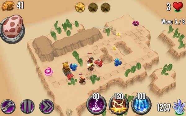 塔防的玩法不用多说大家都知道,这次的炮塔主要是恐龙——你需要将已有的恐龙蛋放在合适的地方,并选择你需要的属性的恐龙来攻击敌人。