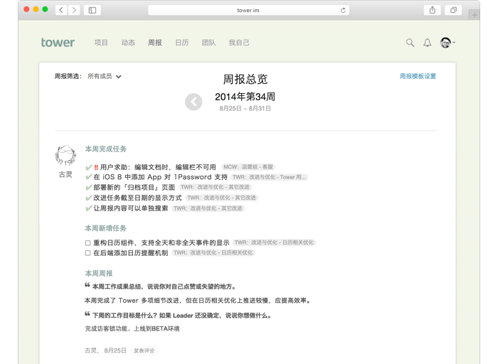 Tower企业办公软件,你的网上办公室,Tower可以帮助你告别冗长的会议、拖沓的进度和繁复的邮件,快速、高效地完成任务,洞悉成员每周进展,纵览团队大小事务,明确各人职责权限,轻松做到对项目了如指掌。