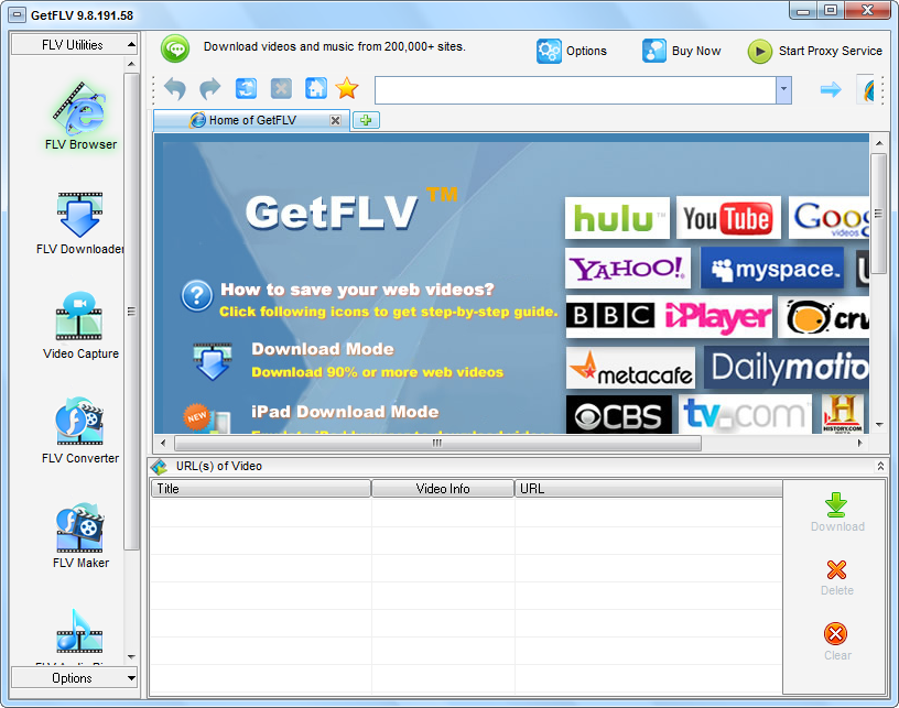 GetFLV Pro软件内置一个网页浏览器,专门用来浏览视频站点,并且能够检测出真是的视频地址并进行下载,此外GetFLV 还支持修复FLV、提取FLV音频、转换FLV等,让你轻轻松松进行视频的转换处理。