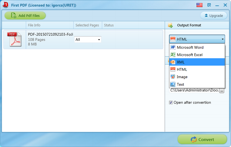 First PDF是一种易于使用的程序,可以让你的PDF文件转换为Microsoft Word支持的文档(DOC格式)或纯文本文件(TXT文件类型)。但你也可以把再成图像,具有以下扩展名:PNG,JPEG,GIF,BMP,TIFF,多页TIFF。