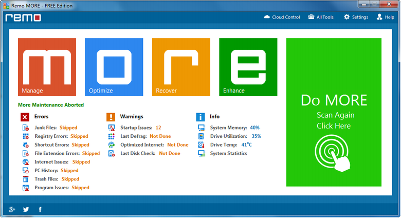 雷莫软件Remo MORE 是一款配备了30 +的功能的软件。用来管理,优化,恢复和增强你的Windows PC。Remo MORE,提供简单和易于使用的用户界面最佳的用户体验。而且metro 风格的UI设计,为用户提供了原生的Windows 的感觉。