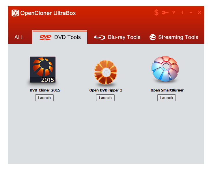 OpenCloner UltraBox是一个6合1软件集合,包括DVD-克隆,打开DVD开膛手,打开SmartBurner,蓝克隆,开放式蓝光开膛手和流-克隆。它们由DVD工具,蓝光工具和流媒体工具进行分类。