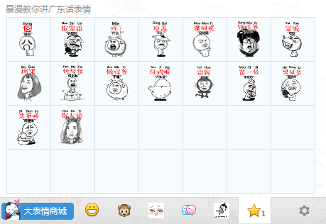 暴漫教你讲广东话qq表情包是款非常有特色的QQ表情;网络流行的暴走漫画人物形象配上广东话,不仅搞笑还能顺便学习一下常见的广东话;此款表情包包括喜欢你(黑凤梨),谁(宾果)、干嘛(做咩爷)等共16款表情,喜欢的朋友可以下载带回家。