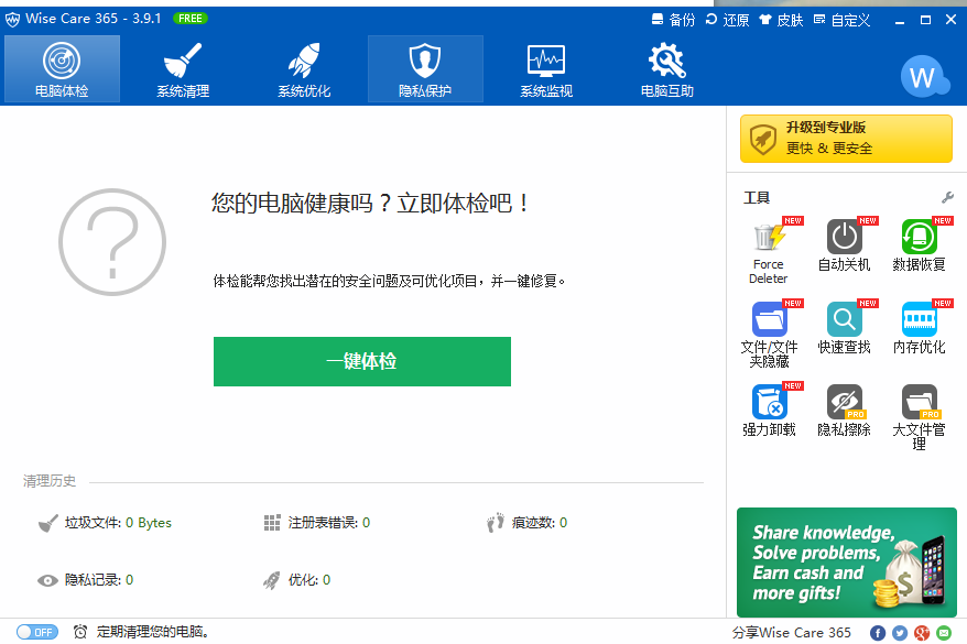 WiseCare365是一款页面简洁友好,功能强大的系统优化管理软件,提供了全面的并且是易于使用的、高效的注册表、磁盘和其他系统实用程序,可以帮助用户轻松的提升电脑系统的性能,是一款非常实用的电脑保护工具。在本页