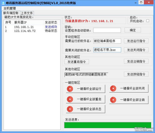唯讯服务器远程批量控制端程序是一款免费的简单易用的Server批量控制软件。该软件包括唯讯服务器远程批量控制端和唯讯服务器远程披批量被控端。通过该软件,用户可以方便的控制多台服务器,而且有些服务器上的软件经常卡死或者需要经常重启机器的,可以用这个软件批量操作。
