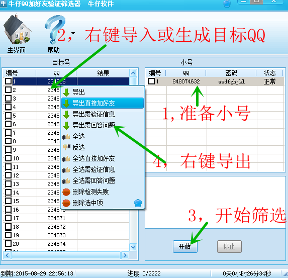 牛仔QQ加好友验证筛选器即单双向筛选器,识别可直接加好友、需回答问题、需验证信息、拒绝加好友等类型的目标QQ,支持分类导出,专为营销而生。所谓暴力加好友即加的是可直接加好友的qq。本软件不用换IP,极少打码,每小时能检测10000个QQ,每天个免费试用5次,每次15分钟。