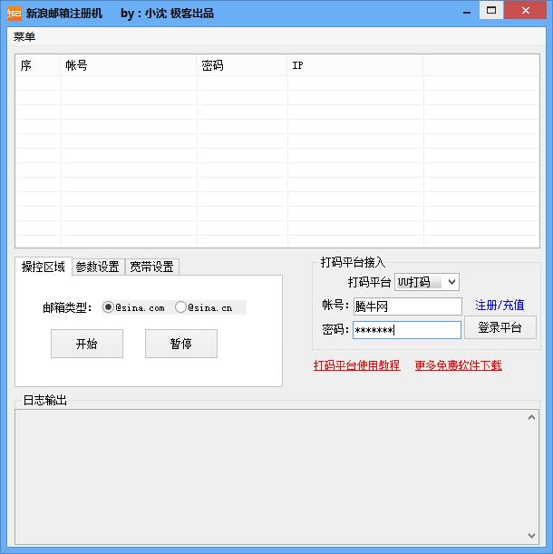 极客新浪邮箱注册机是一款由极客软件最新推出的新浪邮箱批量注册工具,这款软件可以帮助用户自动注册新浪邮箱,支持自动拨号,全自动操作,只需登录打码平台就可以使用,限制注册自动换ip,自动保存注册帐号。欢迎下载使用。