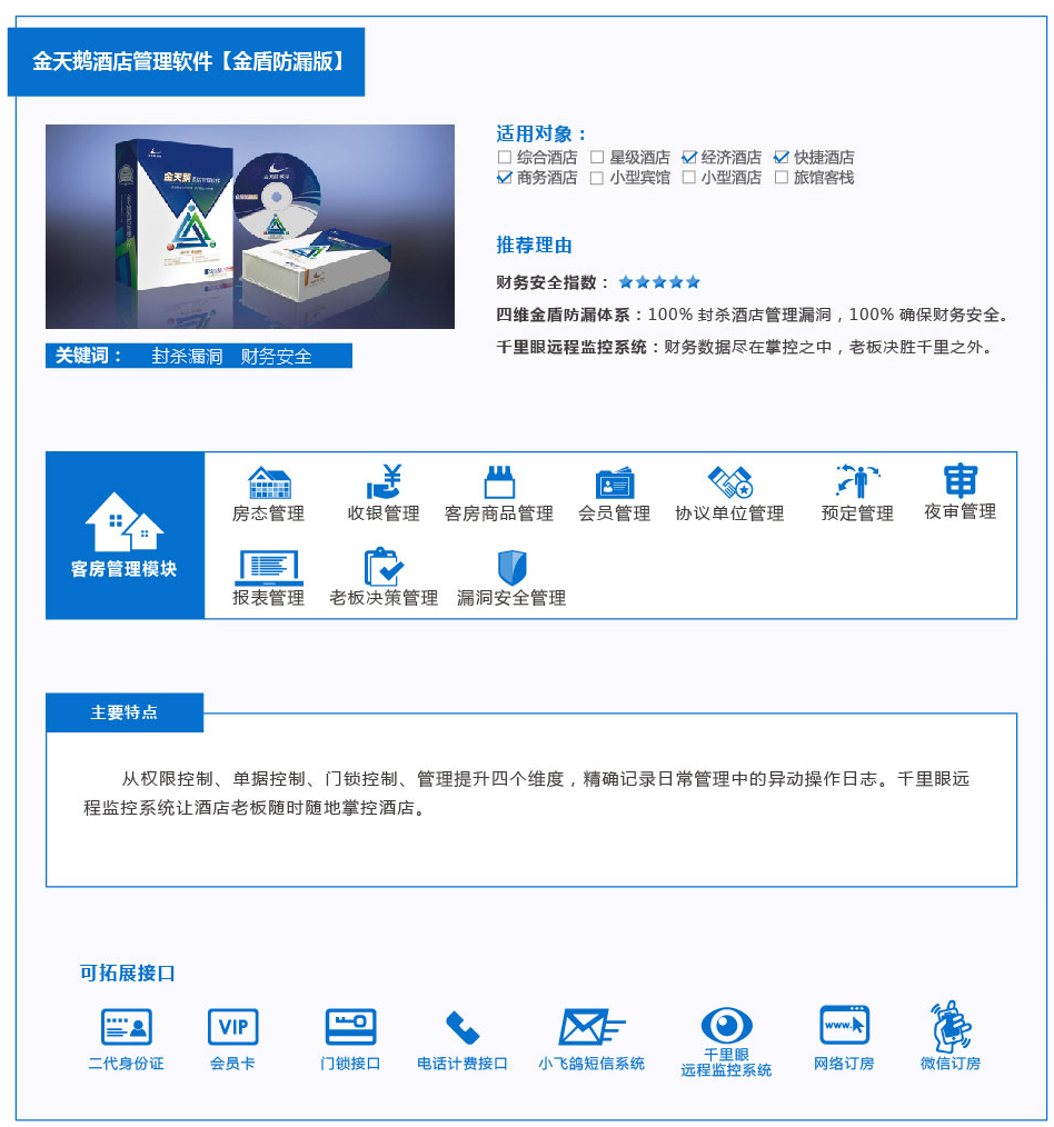 金天鹅软件是国内唯一11年专注酒店管理的软件,针对酒店行业层出不穷的管理漏洞,首创四维金盾防漏体系(权限控制,单据控制,门锁控制,管理提升)节约酒店成本10%以上。目前已有超过30000家酒店正在使用。