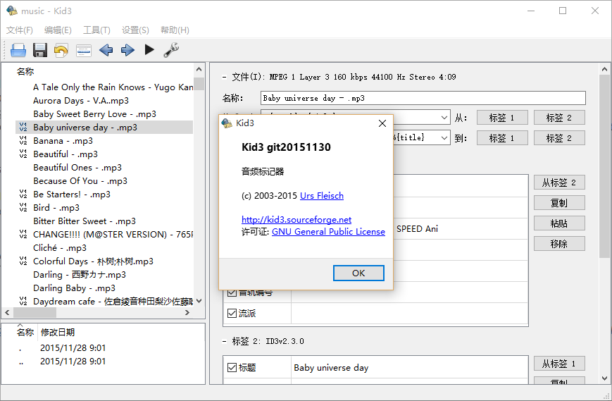 Kid3音频标记器能编辑音频文件的元数据。如果你想轻松地标记多个MP3,OGG/ Vorbis格式,FLAC,MPC,MP4/ AAC,MP2,Opus,Speex,TrueAudio,WavPack,WMA,WAV和AIFF文件,而一次又一次地输入相同的信息并有超过两个的ID3v1和ID3v2标签控制,那么Kid3就是你要找的方案。