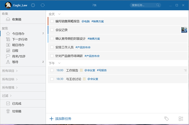 显示各个箱子、项目、情境、目标列表以及过滤箱、已完成箱子和垃圾箱。